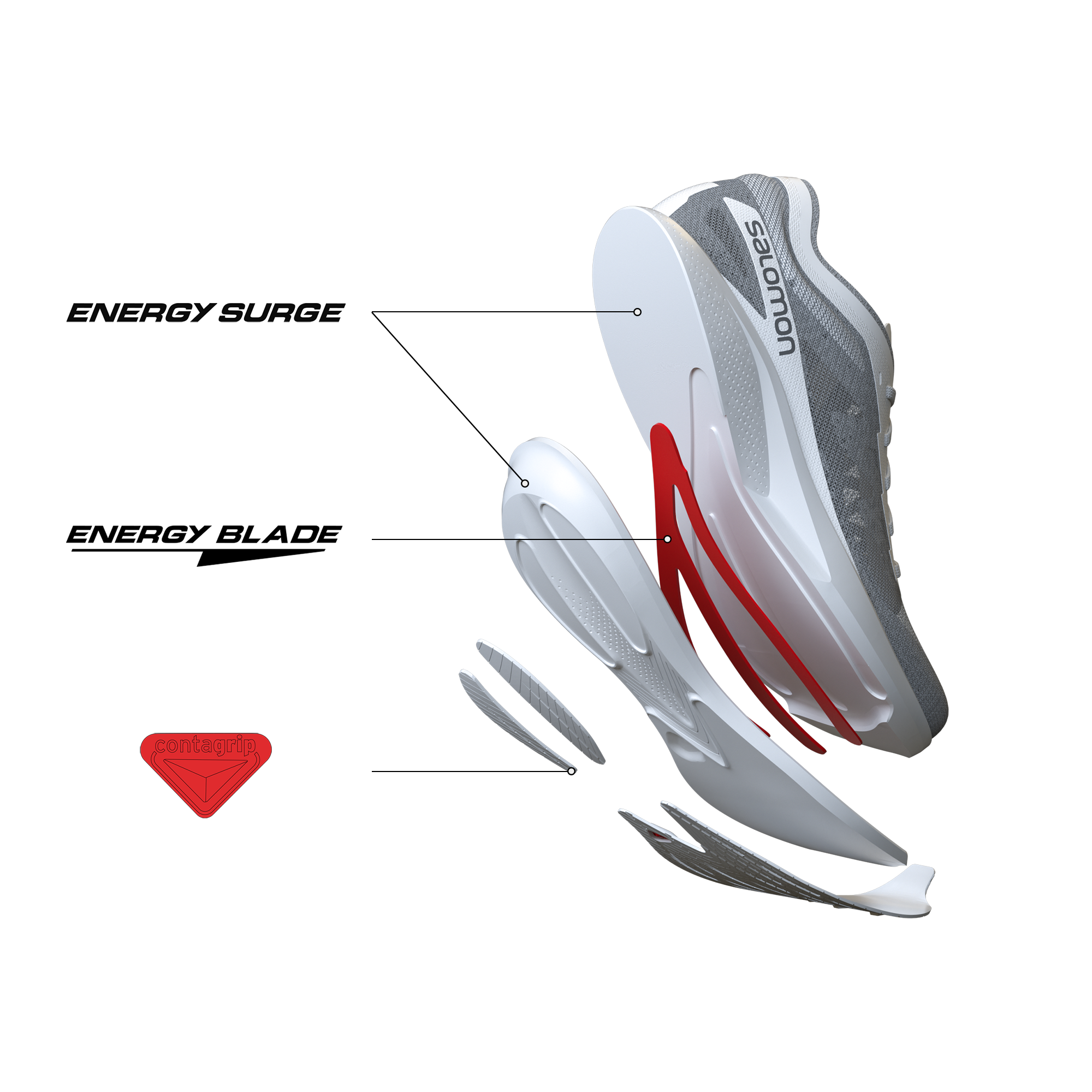 Energy Surge is a lightweight, springy and resilient foam compound that powers your stride forward.