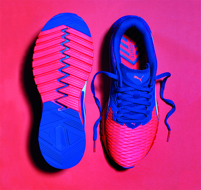 A brand new shoe, designed and created specifically for women. The shoe differs from Puma’s other offerings: it has a wider forefoot, narrower heel, and a contoured upper that cradles the female foot. Ignite foam offers efficient energy return and a soft, cushioned feel, right from the moment you step into the shoe until the end of your run. A flexible-outsole design has been created by deep grooves in the mid- and forefoot, which allows the foot to adapt to surfaces with a large degree of freedom; however, testers said the shoe also provided enough stability to instill confidence on the run.