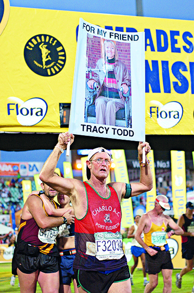 But the encouraging text messages Todd sent throughout his race were all the support Hein needed to keep soldiering on. For the last 30 kilometres of the Comrades, he carried a touching tribute to Todd – a sign, with the words ‘For my friend, Tracy Todd’, and a photograph of Todd, smiling radiantly from her wheelchair.