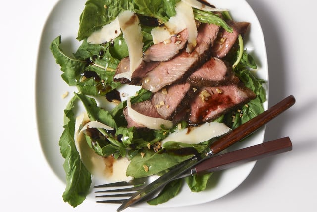 Toss arugula with 1 Tbsp. oil plus salt and pepper. Slice steak into 2cm-thick slices; place on top of rocket. Top with cheese and drizzle vinegar. Serves 2.