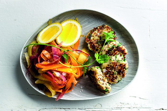 With wet hands, shape spoonfuls of mixture into round, flat patties. Allow to sit in fridge for a few hours, before frying to a crisp and serving with a slice of lemon and a side salad.