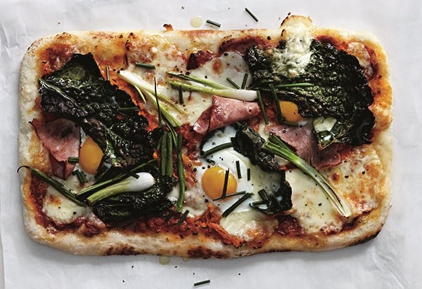 Spread the tomato sauce over the dough. Top with spinach, mozzarella, sweet potato, bacon and spring onions, in that order. Make four ‘nests’ in the toppings and carefully crack an egg into each. Bake for 12 minutes, or until the egg whites are set but yolks are still runny. Sprinkle with chives.