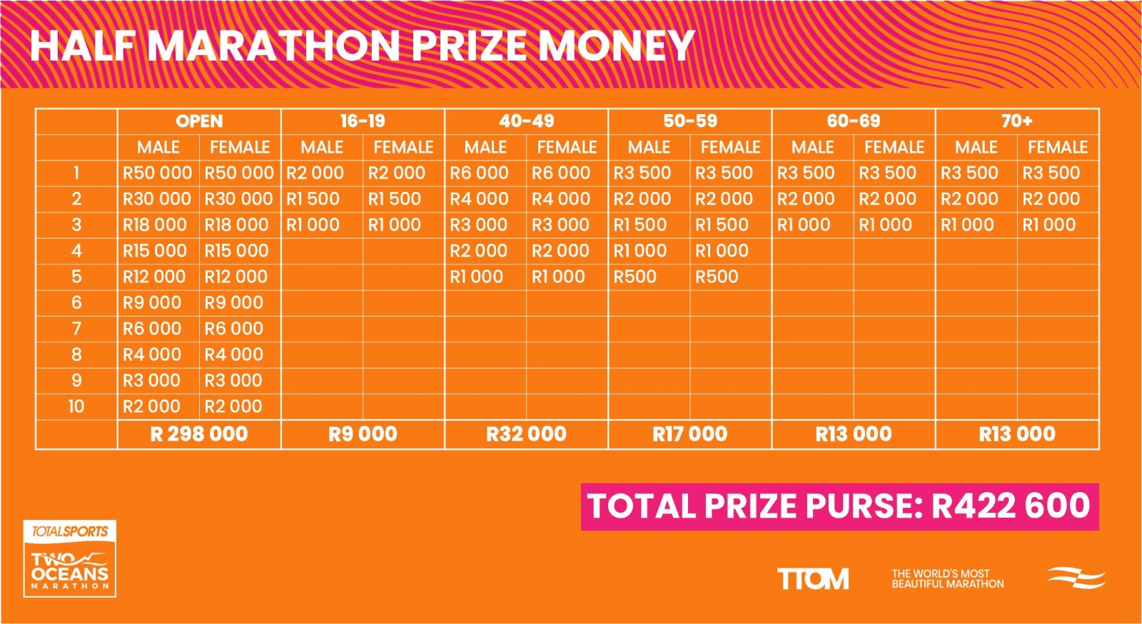 In the Half Marathon, a total of R298 000 has been allocated to the Open Category, with the top 10 finishers sharing in the prize purse. The male and female winners will each take home R50 000, while the runners-up will receive R30 000 and third-place finishers R18 000. Prize money will also be awarded across age categories, with the top five finishers in the 40–49 and 50–59 brackets, and the top three finishers in the 60–69, 70+, and 16–19 age groups, all receiving a share of the rewards.