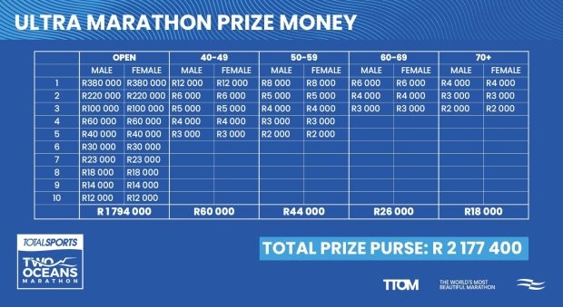 Totalsports Two Oceans Marathon organisers on Wednesday night announced a prize purse of R2.6-million, spread out among all elite and major age categories, for the 2026 race – a 62% increase from 2025.