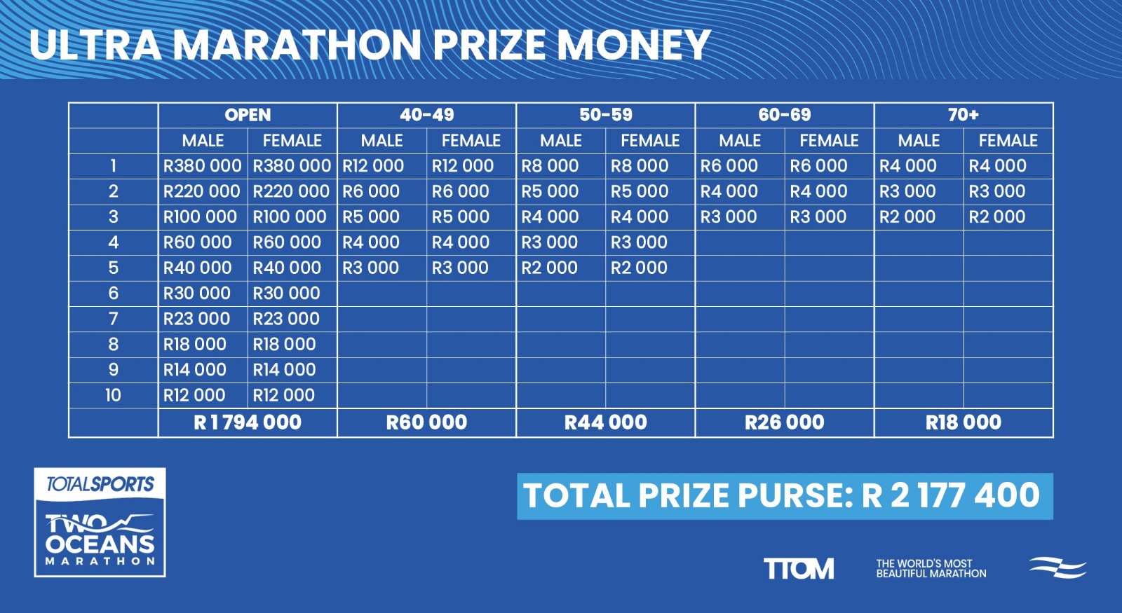 Prize money has also been allocated to Top WPA Athletes, Top South African Athletes (Ultra only) and Teams.