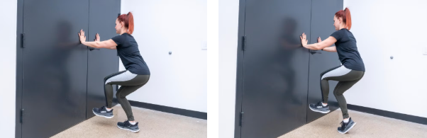 - Lift one leg and bend the knee of the standing leg to about 90 degrees (or as low as you can go). Maintain a bent knee position as you raise onto your toes.