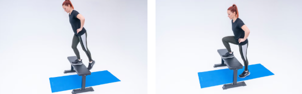 - Stand on top of a bench or box, on the right foot, with the left foot off the surface. (Hold onto a wall or uprights for support if you need it for the first couple of attempts.)