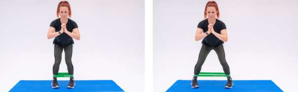 - Place a resistance band around ankles and with feet about hip-width apart, point toes inward.