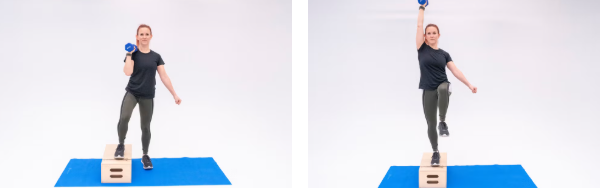 - Step up sideways onto the step. As you stand up, press the weight straight up, and bring the opposing left knee straight up. Aim to have the dumbbell and opposing knee reach their peak height at the same time.