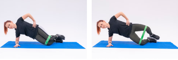 - Place a resistance band above both knees. Lie on the right side with knees bent, elbow underneath the shoulder with forearm on the mat, and hips, knees, and feet stacked.