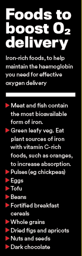 Better news is that your diet can also help, with iron being crucial, as it’s an essential component of haemoglobin. Iron deficiency can limit red blood cell production. ‘And in women, menstruation will also deplete them, so sufficient iron intake is vital,’ says McConnell. Women should aim to consume 14.8mg a day and men, 8.7mg.