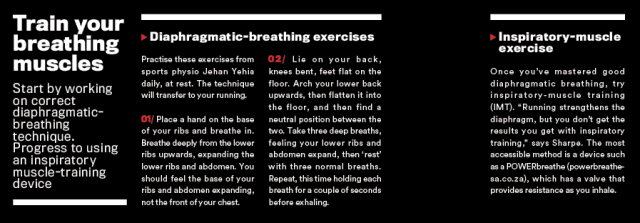 You can train these muscles by practicing deeper, more efficient diaphragmatic breathing (‘belly breathing’) and through inspiratory-muscle training. Several studies on subjects using the popular inspiratory muscle-training device, Powerbreathe, found a 31 per cent improvement in inspiratory-muscle strength, 27 per cent increase in inspiratory-muscle endurance and up to seven per cent faster recovery during sprint repeats.