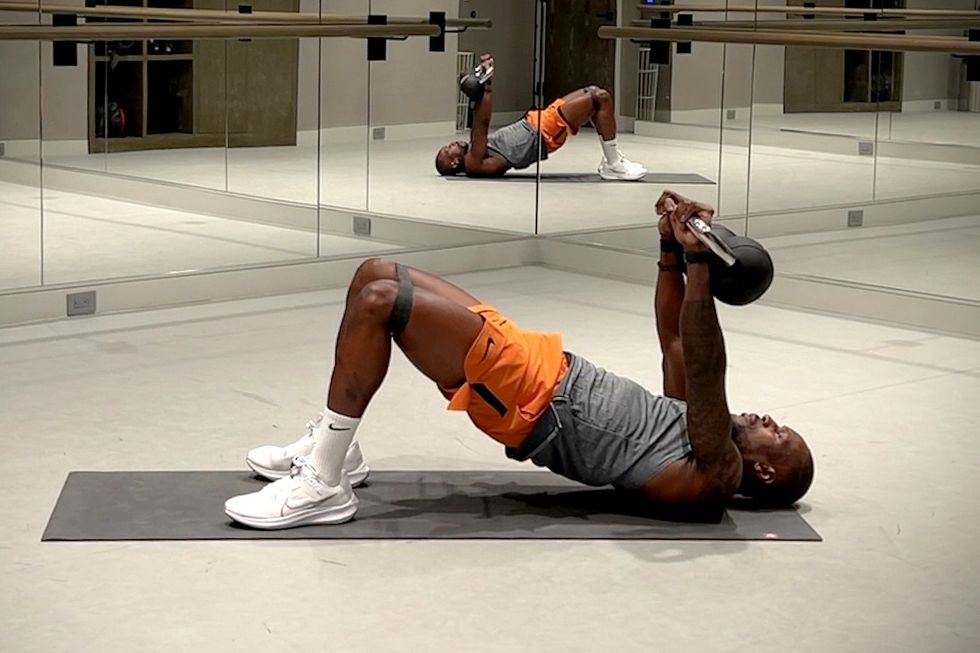 Lie faceup, knees bent, feet planted on the floor, and mini resistance band around legs just above knees. Grab a weight in each hand, then extend arms up, weights over shoulders. Drive through heels, contracting the glutes to lift hips up toward the ceiling. Body should form a straight line from shoulders to knees. Pause for a few seconds. Then lower back down slowly, while keeping arms extended. Repeat.