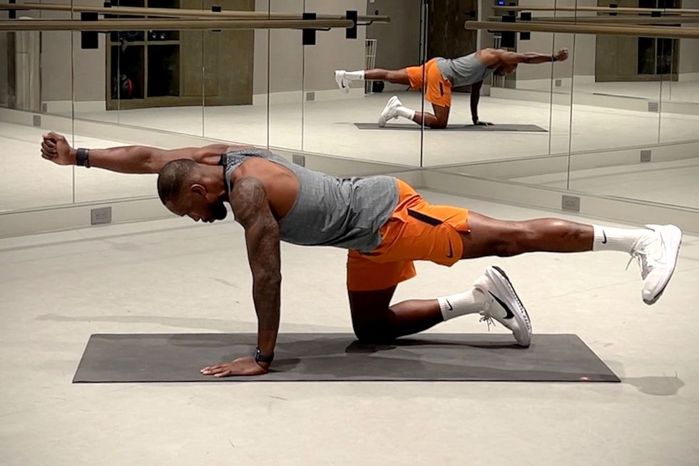 Start on all fours with knees under hips, wrists under shoulders, and palms flat on the mat. Engage core, keeping back flat and spine straight. Extend right arm and left leg, keeping hips and shoulders square to floor. Hold for a few seconds. Pull knee and elbow back in, under torso. Then return to all fours. Repeat on other sides. Continue alternating.