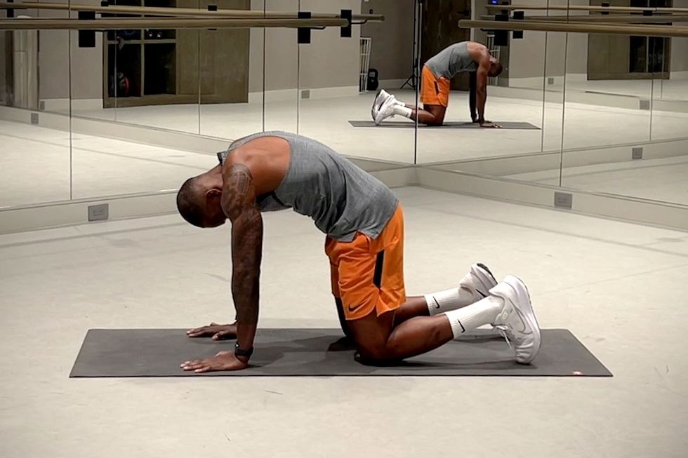 Start on all fours with knees under hips, wrists under shoulders, and palms flat on the mat. Inhale to arch back, drop the belly, and tilt head up. Exhale and round back, tucking chin and hips downward. That’s 1 rep. Repeat, moving with your breath.