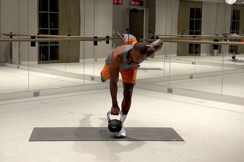 Stand with weight in left hand. Shift weight to right leg, and with a soft bend in right knee, hinge at the hips by sending butt back. Keep back flat, shoulders down, and core engaged as torso reaches toward the floor and left leg lifts straight back behind you. Only lower until you feel a slight pull in right back of leg; you don’t have to lower weight to ground, but keep weight close to body. Drive right foot into floor to stand back up, squeezing glutes. Repeat for reps. Then switch sides.