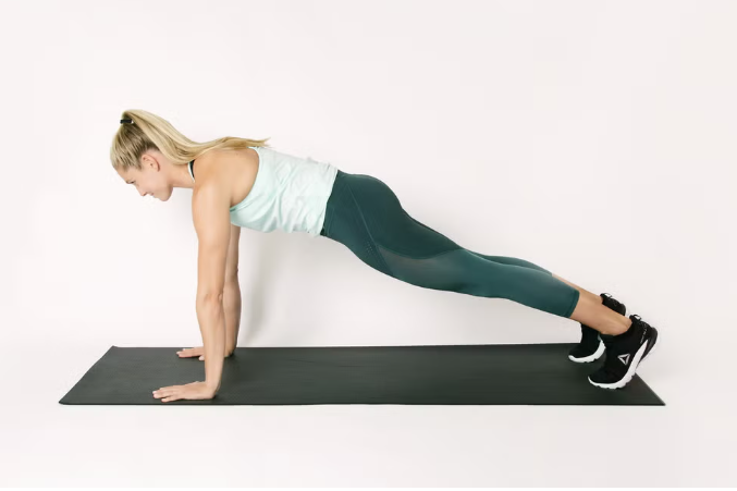 Start at the top of a push-up position, shoulders directly over your wrists. Draw shoulders down and back and engage abdominal muscles tightly to keep hips in line with shoulders so your body forms a long, straight line. Squeeze legs and glutes for support and hold this position for 45 to 60 seconds, or lower chest to hover above the floor before pushing back up to start for a full push-up.