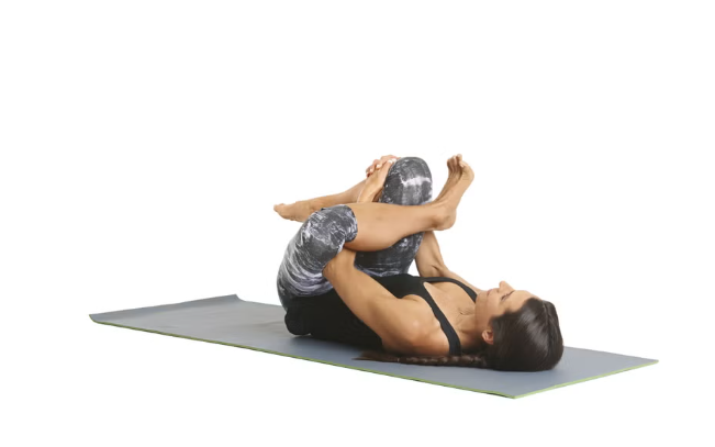 Lie face up with both knees bent, feet flat on the mat. Cross left ankle over right knee and keep left foot flexed. Thread your hands between your legs to grab behind the right thigh and pull the right leg toward the chest until you feel a stretch in the left hip. Hold for 30 seconds. Repeat on the other side.